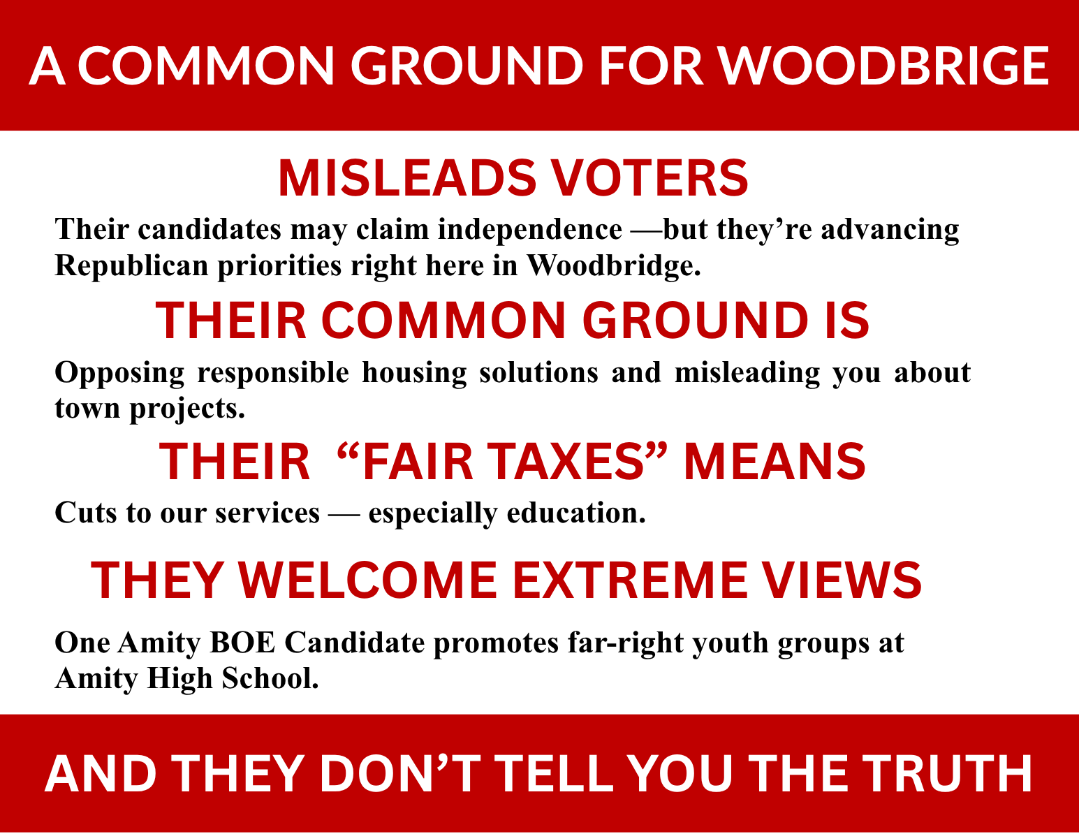 As many of you know, there is a block of candidates campaigning under the banner “A Common Ground for Woodbridge,” a self-described “group of your neighbors from four different political affiliations.”