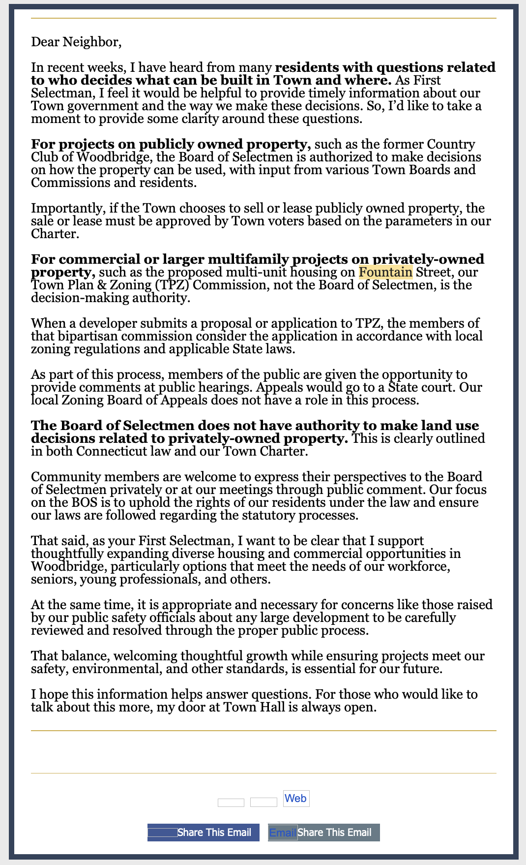 That said, as your First Selectman, I want to be clear that I support thoughtfully expanding diverse housing and commercial opportunities in Woodbridge, particularly options that meet the needs of our workforce, seniors, young professionals, and others.