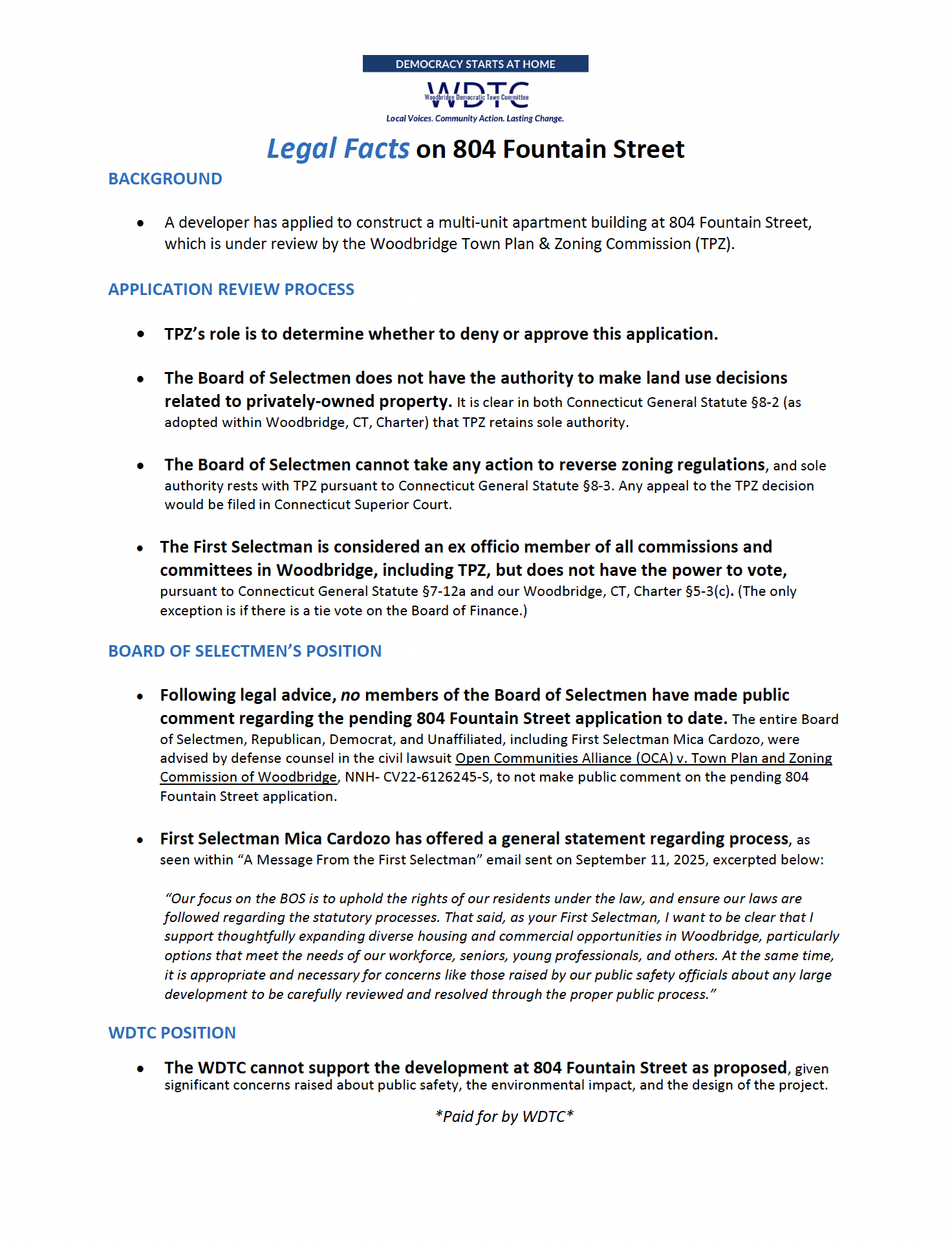 Following legal advice, no members of the Board of Selectmen have made public comment regarding the pending 804 Fountain Street application to date. The entire Board of Selectmen, Republican, Democrat, and Unaffiliated, including First Selectman Mica Cardozo, were advised by defense counsel in the civil lawsuit Open Communities Alliance (OCA) v. Town Plan and Zoning Commission of Woodbridge, NNH-CV22-6126245-S, to not make public comment on the pending 804 Fountain Street application.